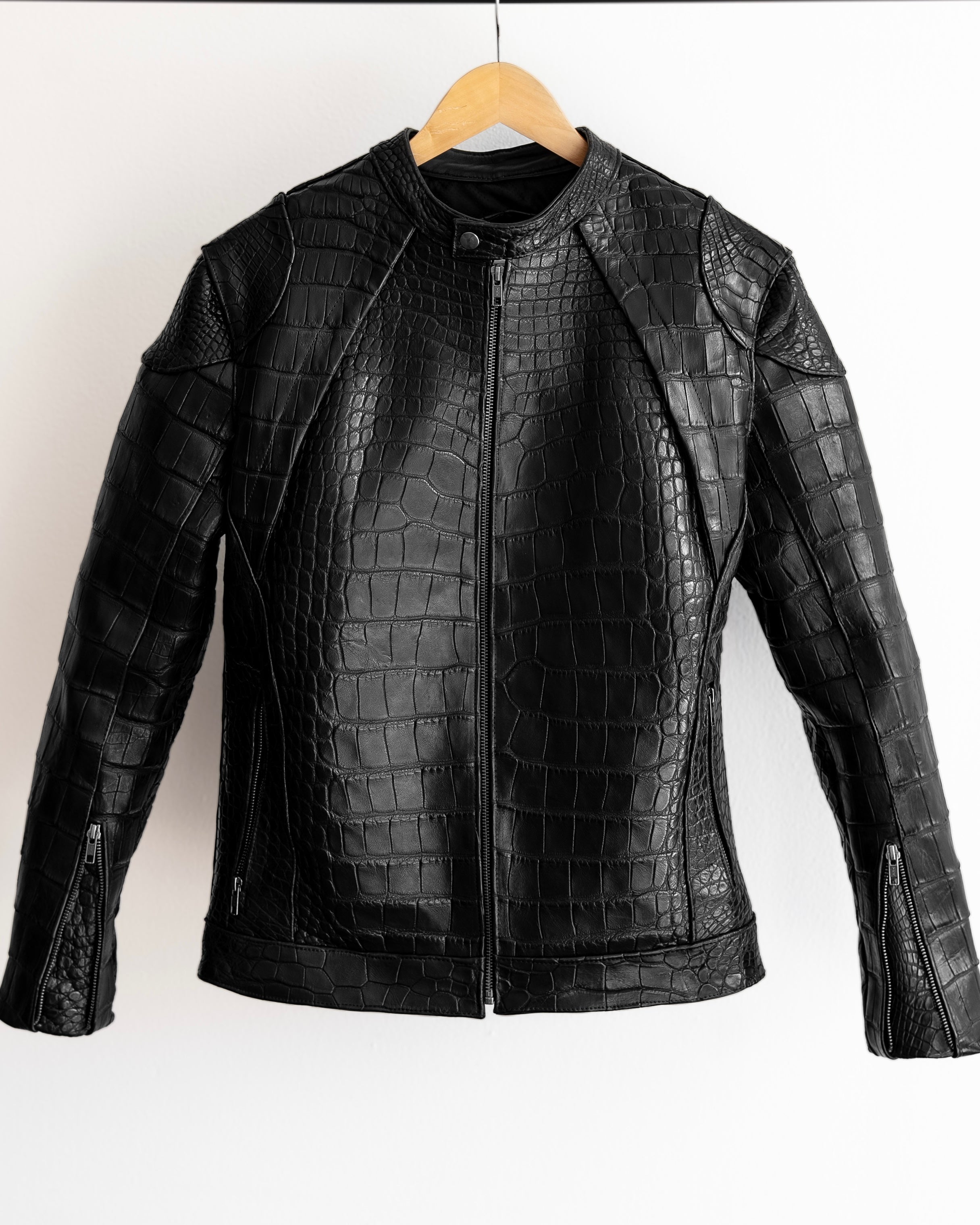 Elaborada con piel de cocodrilo de la más alta calidad, esta prenda destaca por su textura única, diseño y acabado premium.